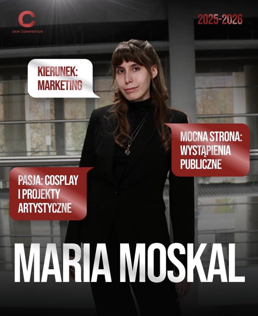 Maria to studentka I roku studiów magisterskich na kierunku Marketing, która obecnie stoi na czele SKN Compertus. Jej przygoda w kole zaczęła się od roli Liderki działu HRiKZ, gdzie szlifowała umiejętności zarządzania zespołem i koordynacji projektów, takich jak „Przestrzeń Pełna Pomysłów” na Uniwersytecie Ekonomicznym w Poznaniu. Jako Przewodnicząca dba o to, by wszystkie działania koła były spójne, wyznacza strategiczne cele na kolejne semestry i czuwa nad pracą całego zespołu.