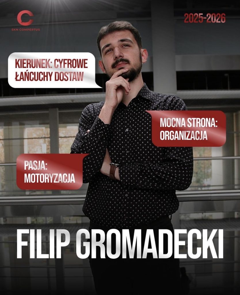 Filip, student I roku studiów magisterskich na kierunku Cyfrowe Łańcuchy Dostaw, pełni w kole funkcję Wiceprzewodniczącego. Wcześniej, w roku akademickim 2025–2026, z powodzeniem prowadził dział marketingu jako jego Lider, a swoje kompetencje rozwijał także w ramach IV edycji programu SLL UEP. W zarządzie koncentruje się na wspieraniu Przewodniczącej w codziennym zarządzaniu organizacją oraz na ścisłej współpracy z liderami działów, aby wszystkie projekty przebiegały sprawnie i bez zakłóceń.