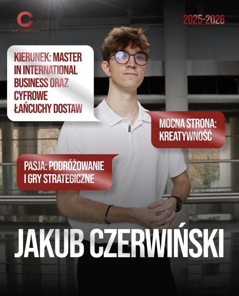 Jakub to doświadczony lider, który obecnie wspiera zarząd swoją wiedzą merytoryczną jako Pełnomocnik. Studiuje jednocześnie dwa kierunki magisterskie: Master in International Business oraz Cyfrowe Łańcuchy Dostaw, a doświadczenie międzynarodowe zdobywał podczas wymiany Erasmus w Holandii. W przeszłości pełnił funkcje Przewodniczącego i Wiceprzewodniczącego koła, realizując ambitne projekty dla takich marek jak Volkswagen (Gra Agile), Petsy czy Spring Forth Food. Jest również uczestnikiem III edycji programu SLL UEP.